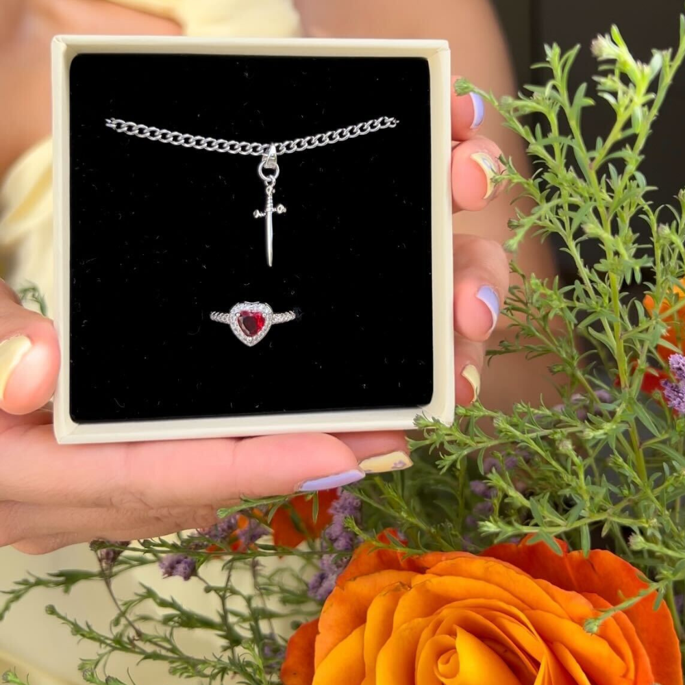 Ono što čini ovaj poklon posebnim nije samo dizajn, već značenje koje nosi. Mač sa narukvice savršeno ulazi u srce na prstenu — kao ključ i brava, kao zaštita i emocija, kao on i ona. Kada se poklon nosi u paru, postaje više od simbolike. Postaje svakodnevni podsetnik na vezu, na poverenje, na tu tihu zakletvu između dvoje — bez reči.