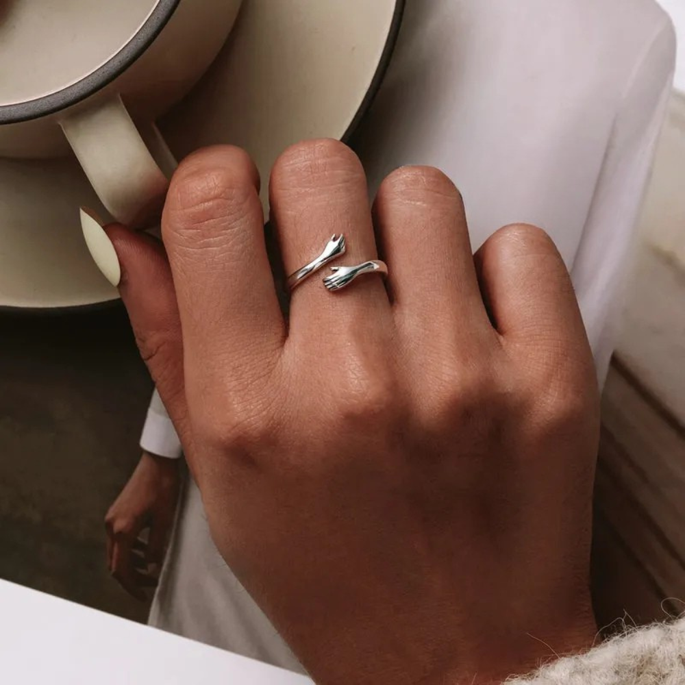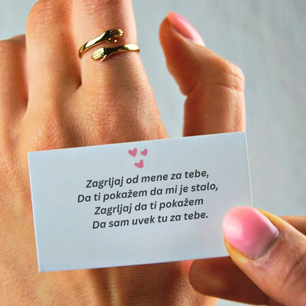 Ponekad nam je dovoljan jedan pogled na prst da se setimo da nismo sami. Ovaj prsten te prati svuda – na putovanjima, kroz stresne dane, ili dok si daleko od onih koje voliš. Dve ruke koje se drže oko tvog prsta su tihi znak da je zagrljaj uvek tu, čak i kada nije fizički prisutan.
